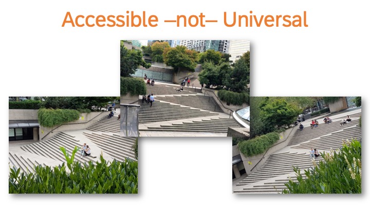 - This stairway is located in Vancouver, Canada. While it seems accessible, and it is true that it allows for people to move up the space without having to use the stairs, it isn't universal because those people who have to use a ramp are less inclined to use this one due to the way it is designed. This is touched on again later in the presentation.